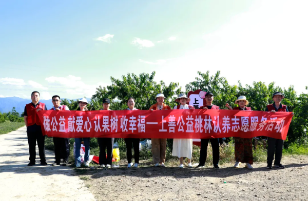 上善公益桃林位于宝鸡市金台区金河镇紫原村的紫草塬田园综合体内,占地约7亩,种植黄桃树500余棵。该项目已持续九年,被授予陕西省最佳志愿服务项目,同时入选首届陕西520公益季十大共享公益案例,活动通过宣读绿色环保宣言,通过倡导绿色环保,人人争做爱绿护绿的志愿者,为天更蓝、水更碧的美丽宝鸡做出自己的贡献。