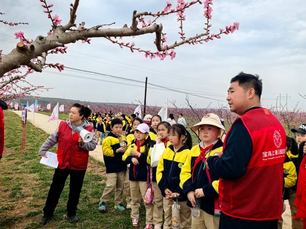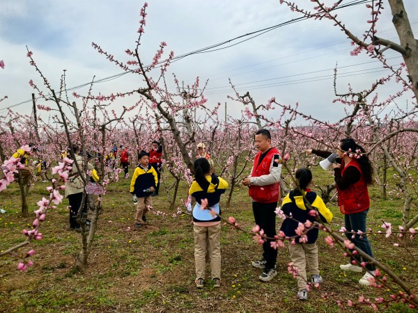 活动当天,孩子们兴高采烈地走进桃林,宝鸡市园艺技术工作站的农艺师郭红艳早已在桃林间等候多时。站在桃花竞相绽放的桃林中,她耐心细致地向孩子们讲解桃树种植的基础知识:“大家看,桃花有几个花瓣?对,就是五瓣!通过蜜蜂等昆虫授粉后,我们还要给桃树疏花疏果,另外还要适时剪枝,这样桃子才能长得又大又甜。”接着,郭红艳结合桃树生长周期,详细讲解了施肥要点:“春天桃树发芽时需要氮肥,促进枝叶生长;夏天结果期要补充磷钾肥,帮助果实膨大。”孩子们听得十分专注,不时举手提问:“郭老师,什么时候给桃树浇水最好呀?”“如果发现叶子黄了是缺营养吗?”郭红艳一一耐心解答,还引导孩子们轻轻触摸桃树嫩绿的芽苞,感受生命萌发的力量。