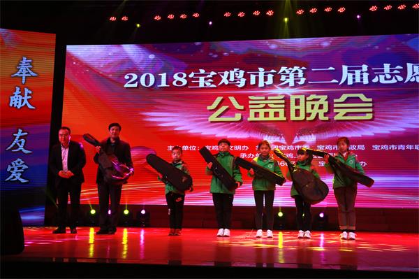 晚会现场,爱心单位宝鸡爱乐汇文化艺术发展有限公司向来自麟游山区的孩子们捐赠吉他和小提琴。