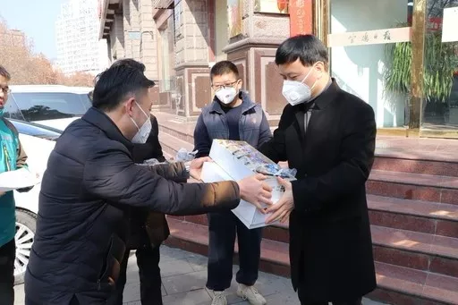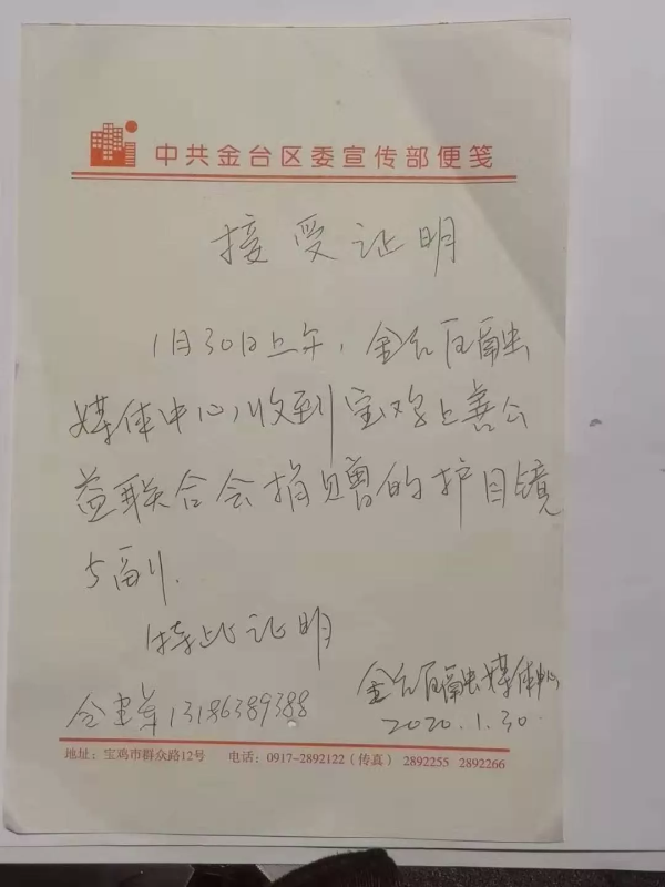金台区联合会志愿者走进金台区,为金台医院的医护人员和金台区融媒体中心新闻工作者,送去护目镜。
