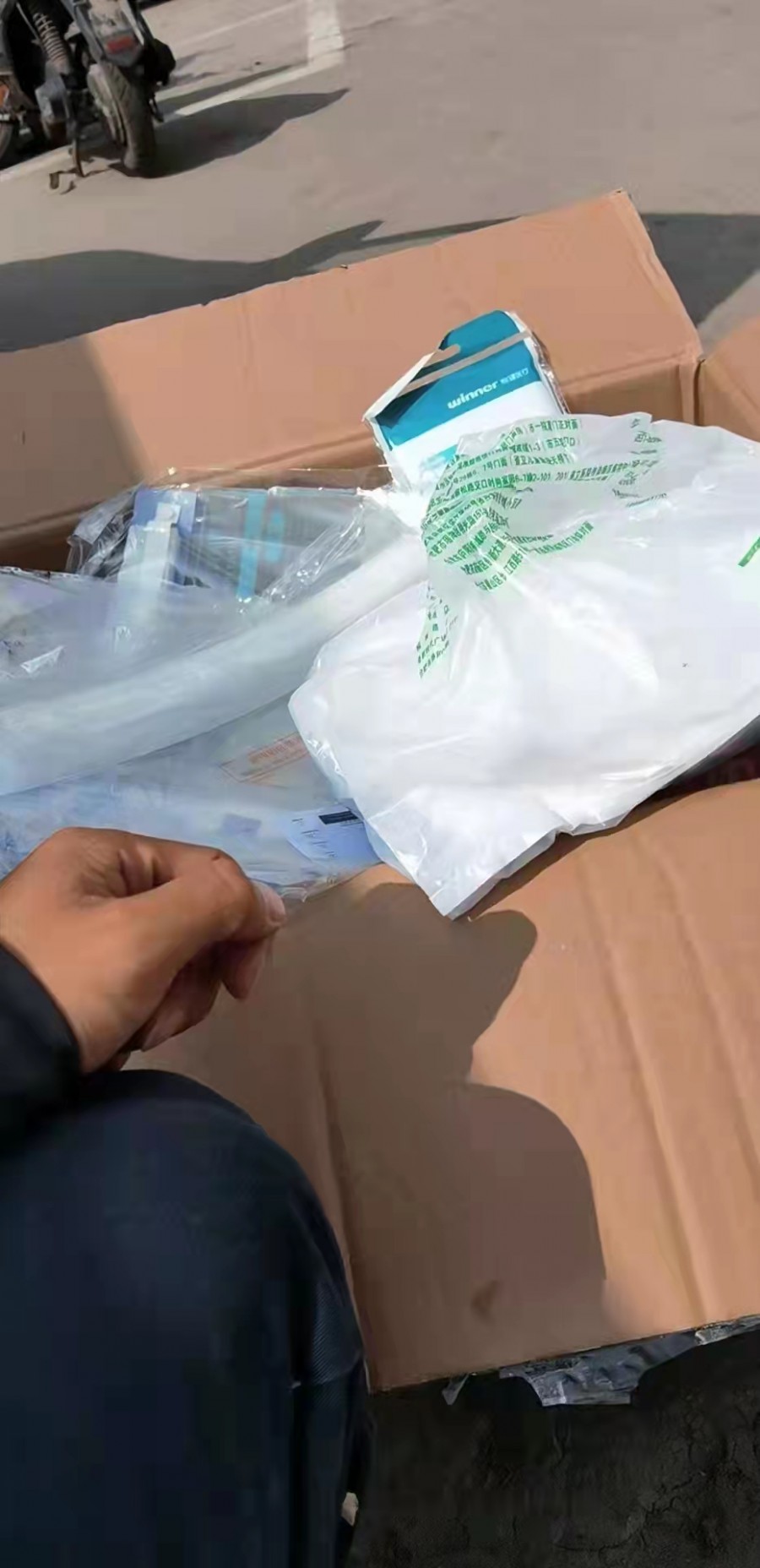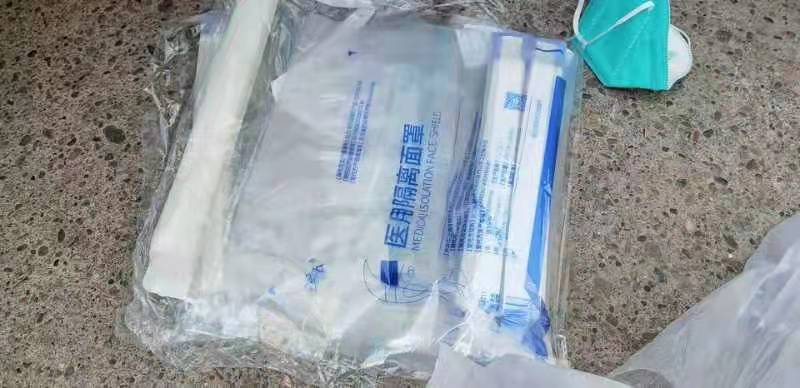 3月25日下午,联合会接收到这批物资后,对其进行了清点,其中包括医用外科口罩1350支、N95口罩101支、橡胶外科手套19双、手消3瓶、防护面罩4个、防护服2套、防护帽26个、鞋套2副。