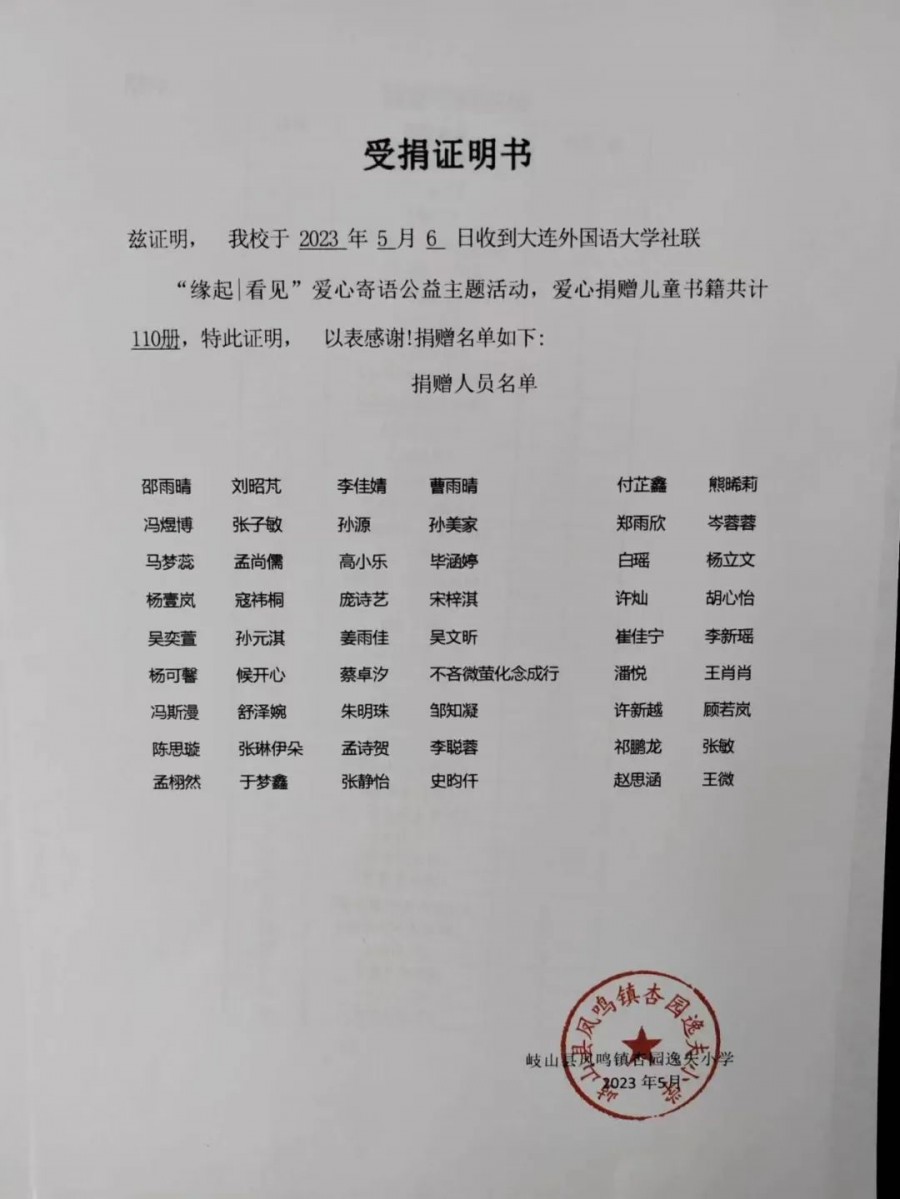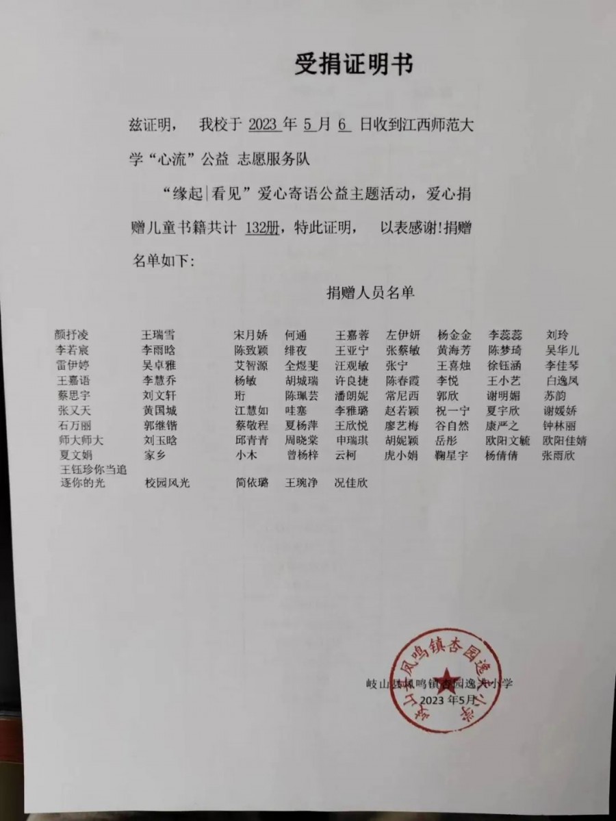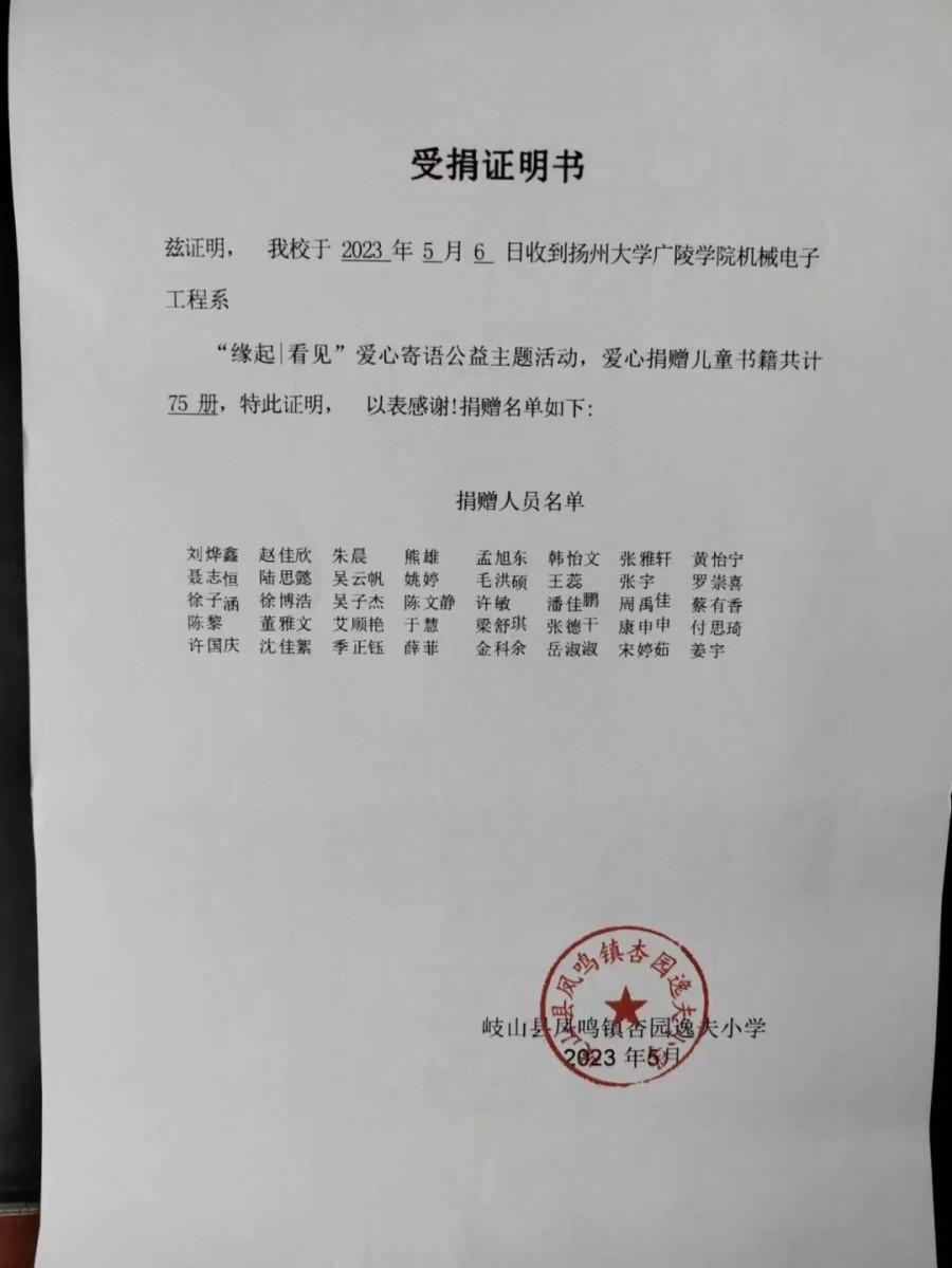 2023年5月8日,由扬州大学广陵学院机械电子工程系捐赠图书75册、大连外国语大学社联捐赠图书110册、江西师范大学“心流”公益志愿服务队捐赠图书132册,共计317册捐赠给岐山杏园逸夫小学。该批图书现已通过快递,送到了杏园逸夫小学的孩子们手中,本期活动由宝鸡上善公益联合会共青团岐山县委、岐山杏园逸夫小学在该校联合展开。