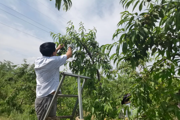 清晨8时许,三代同堂的劳作场景成为上善公益桃林最美风景。60岁的李奶奶手把手教孙辈识别"优等果",年轻父母举着孩子观察叶脉生长。“保留间距三指宽的壮果,让每个桃子都能晒到太阳。"联合会负责人张红兵的现场教学引得众人围听。据测算,通过科学疏果可使单果重量提升30%,糖度增加5个百分点。