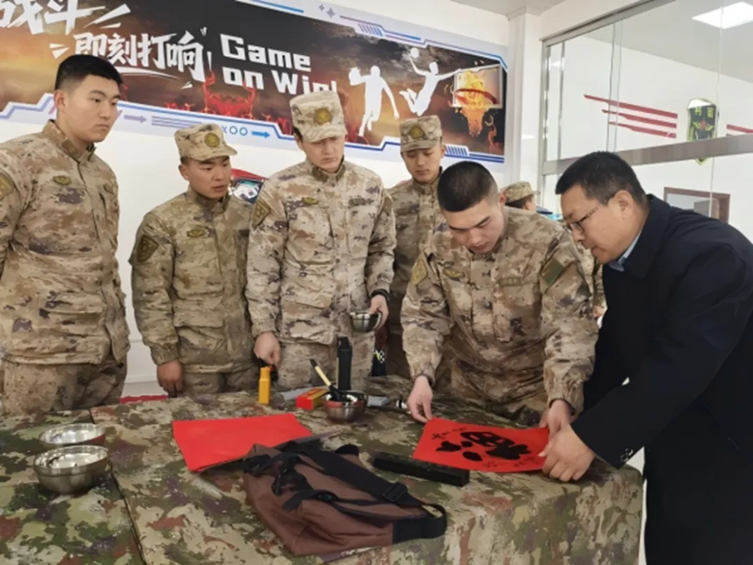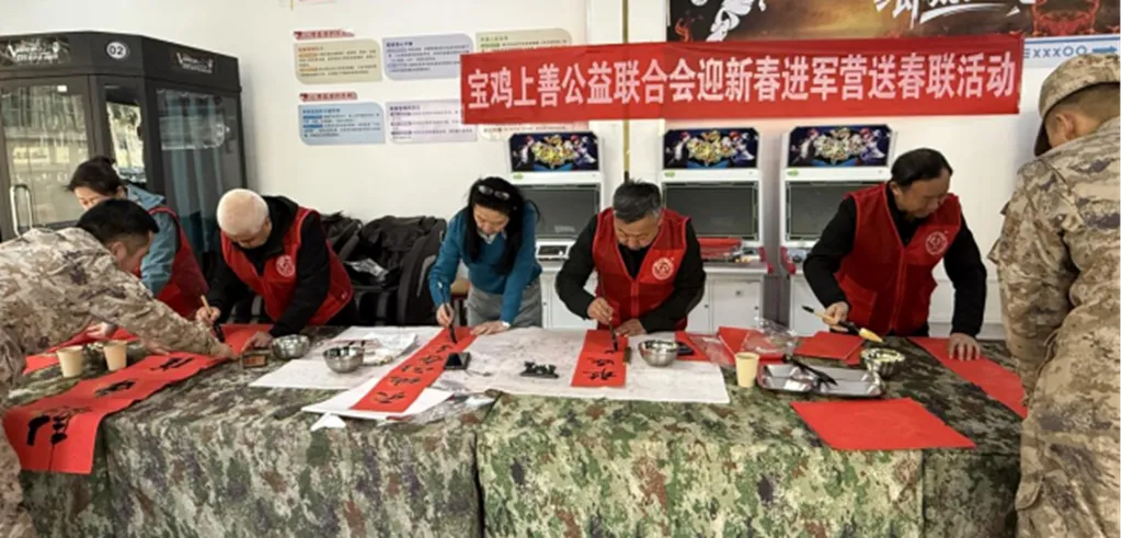 军民同心,其利断金。为弘扬拥军优属光荣传统,深化军民鱼水深情,2月7日,宝鸡上善公益联合会工会组织书法志愿者走进驻宝32147部队,开展“迎新春进军营送春联”志愿服务活动,为坚守岗位的子弟兵送上墨香祝福与新春问候,这也是联合会“情暖最可爱的人”系列项目连续第三年走进军营开展此类活动。