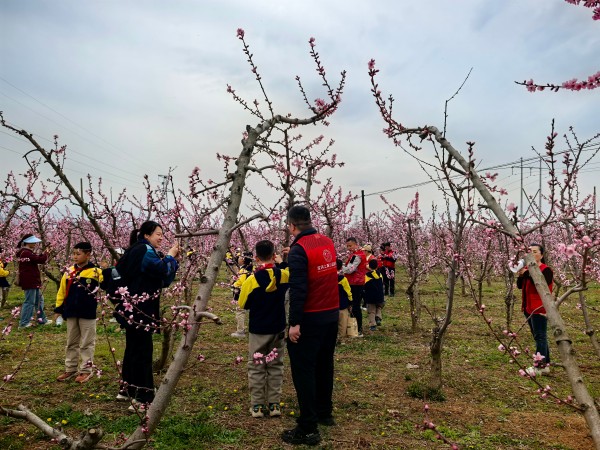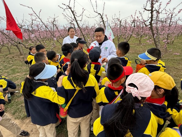 活动当天,孩子们兴高采烈地走进桃林,宝鸡市园艺技术工作站的农艺师郭红艳早已在桃林间等候多时。站在桃花竞相绽放的桃林中,她耐心细致地向孩子们讲解桃树种植的基础知识:“大家看,桃花有几个花瓣?对,就是五瓣!通过蜜蜂等昆虫授粉后,我们还要给桃树疏花疏果,另外还要适时剪枝,这样桃子才能长得又大又甜。”接着,郭红艳结合桃树生长周期,详细讲解了施肥要点:“春天桃树发芽时需要氮肥,促进枝叶生长;夏天结果期要补充磷钾肥,帮助果实膨大。”孩子们听得十分专注,不时举手提问:“郭老师,什么时候给桃树浇水最好呀?”“如果发现叶子黄了是缺营养吗?”郭红艳一一耐心解答,还引导孩子们轻轻触摸桃树嫩绿的芽苞,感受生命萌发的力量。
