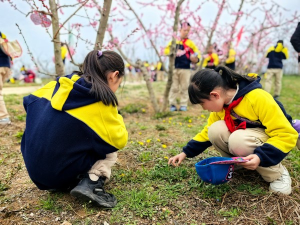 随后,在老师带领下,孩子们辨识荠菜、苜蓿,体验农耕乐趣。“原来桃花不仅好看,桃树还能结出甜甜的黄桃,挖野菜也需要耐心观察呢!”三十班学生孙祎晓捧着刚挖的野菜,脸上满是成就感。