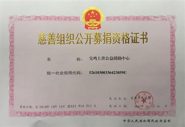 2018年10月16日,宝鸡上善公益援助中心(全国最佳志愿服务组织)获批慈善组织公开募捐资格!