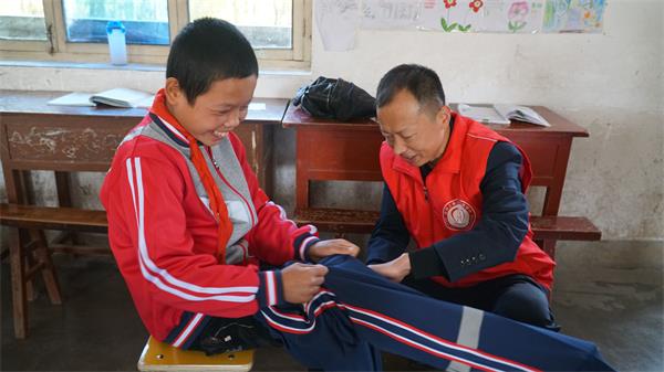 △志愿者为孩子们穿上安全校服